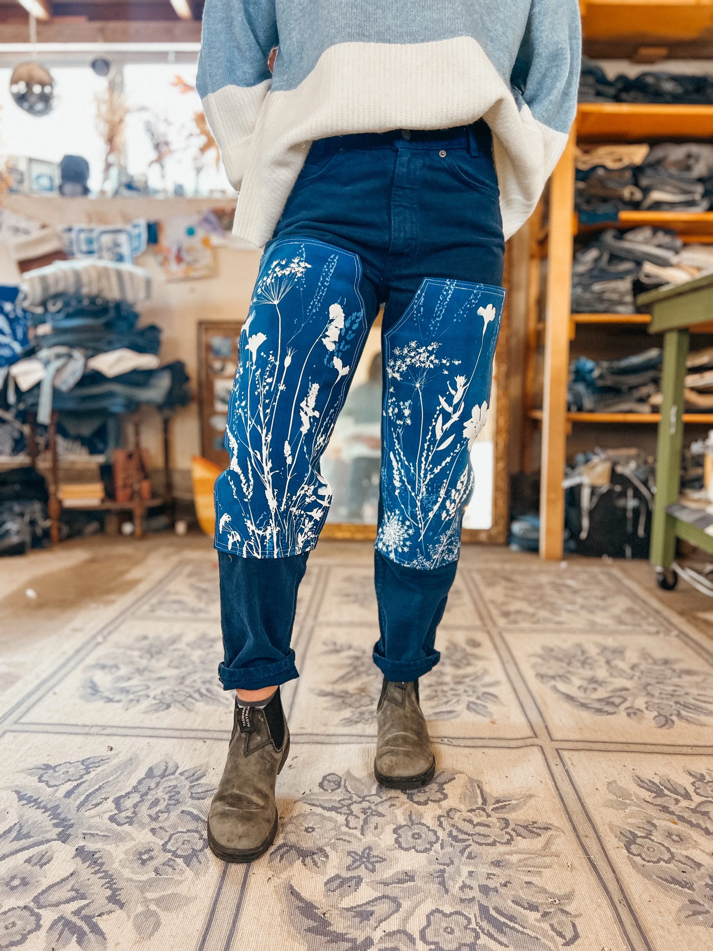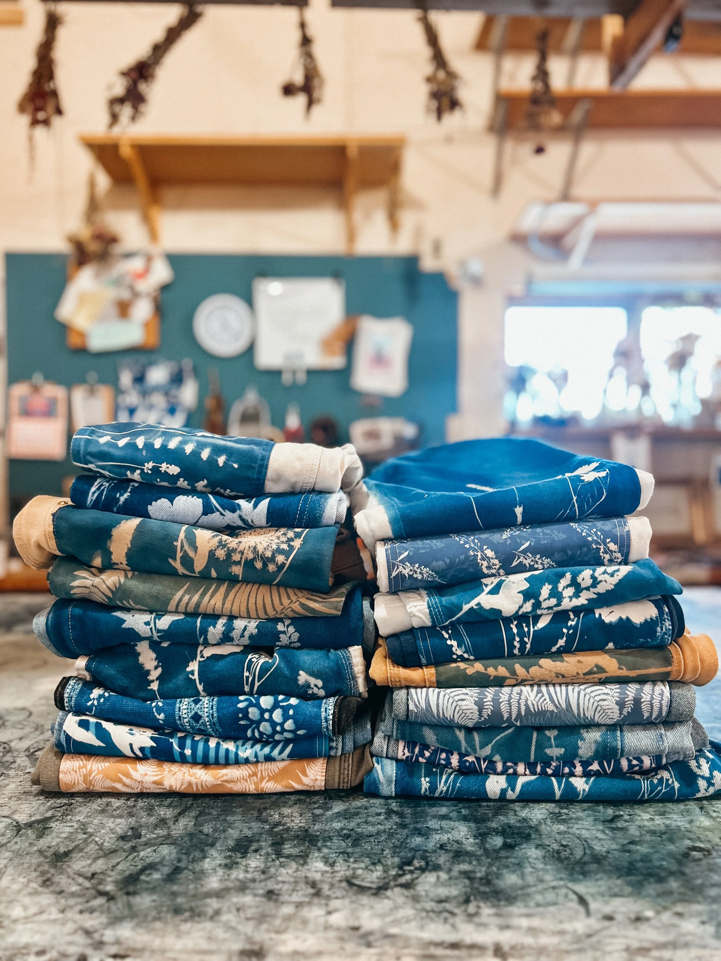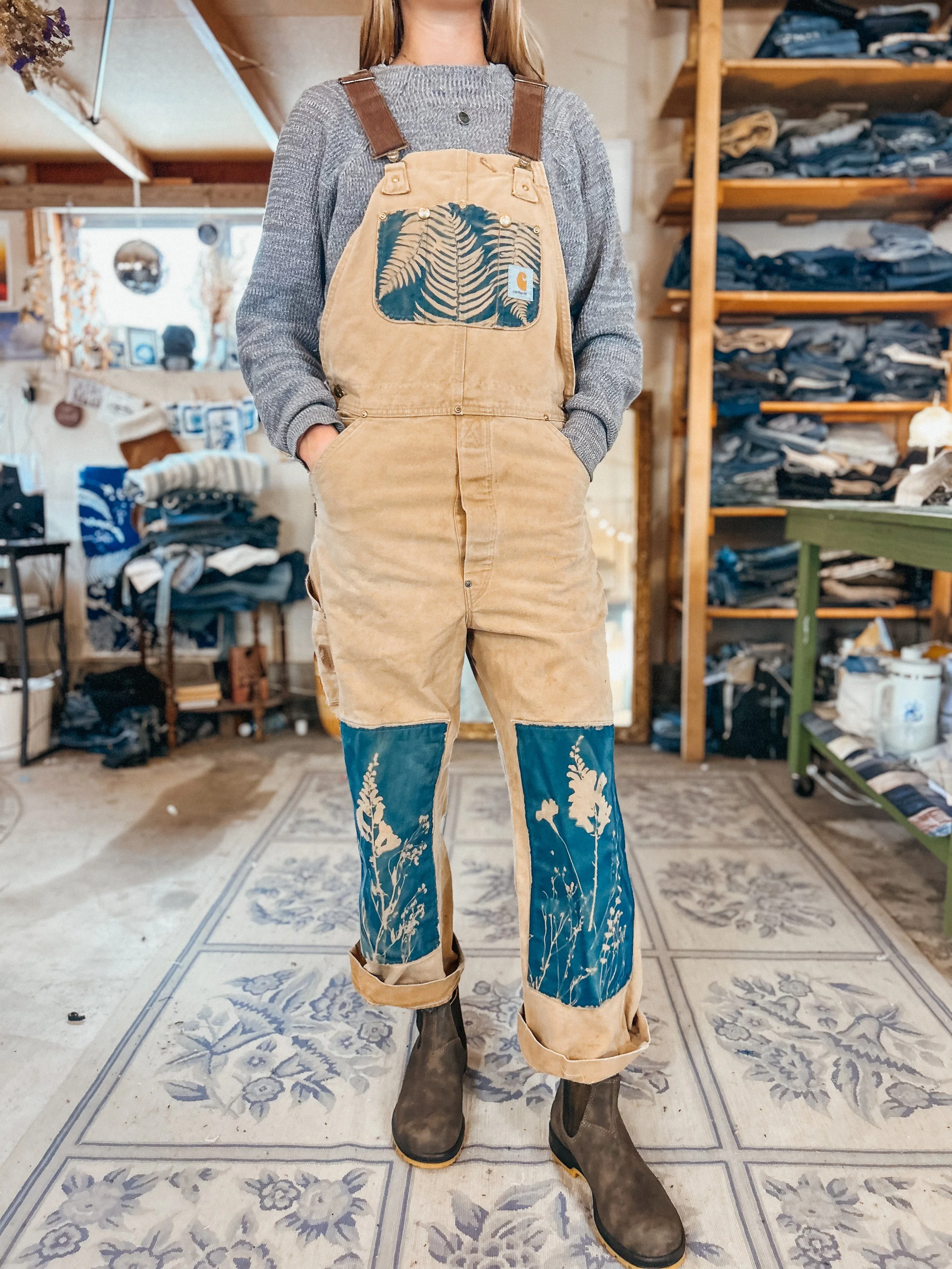 The KSX x Carhartt collection is a limited release that brings my cyanotype designs to classic Carhartt silhouettes in a fresh, whimsical way. The collection includes overalls, two shirts, a canvas hat, and a heavy-duty tote bag—all featuring nature-inspired prints that celebrate the beauty of the outdoors. A few pieces are available now in select Carhartt Company Stores, but the full collection is officially online! Stock is limited and selling quickly.